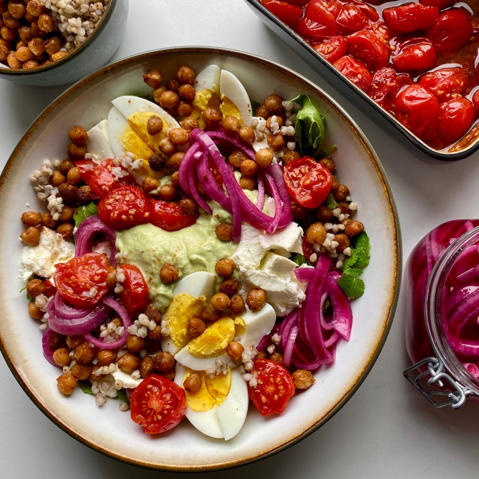 Bokhvetesalat med krydrede ovnsbakte kikerter og avokadodressing