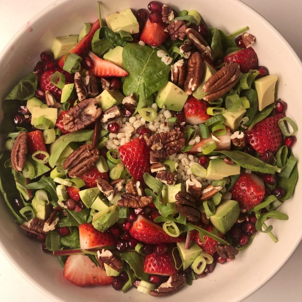 Byggrynsalat med jordbær, granateple og ristede pekannøtter
