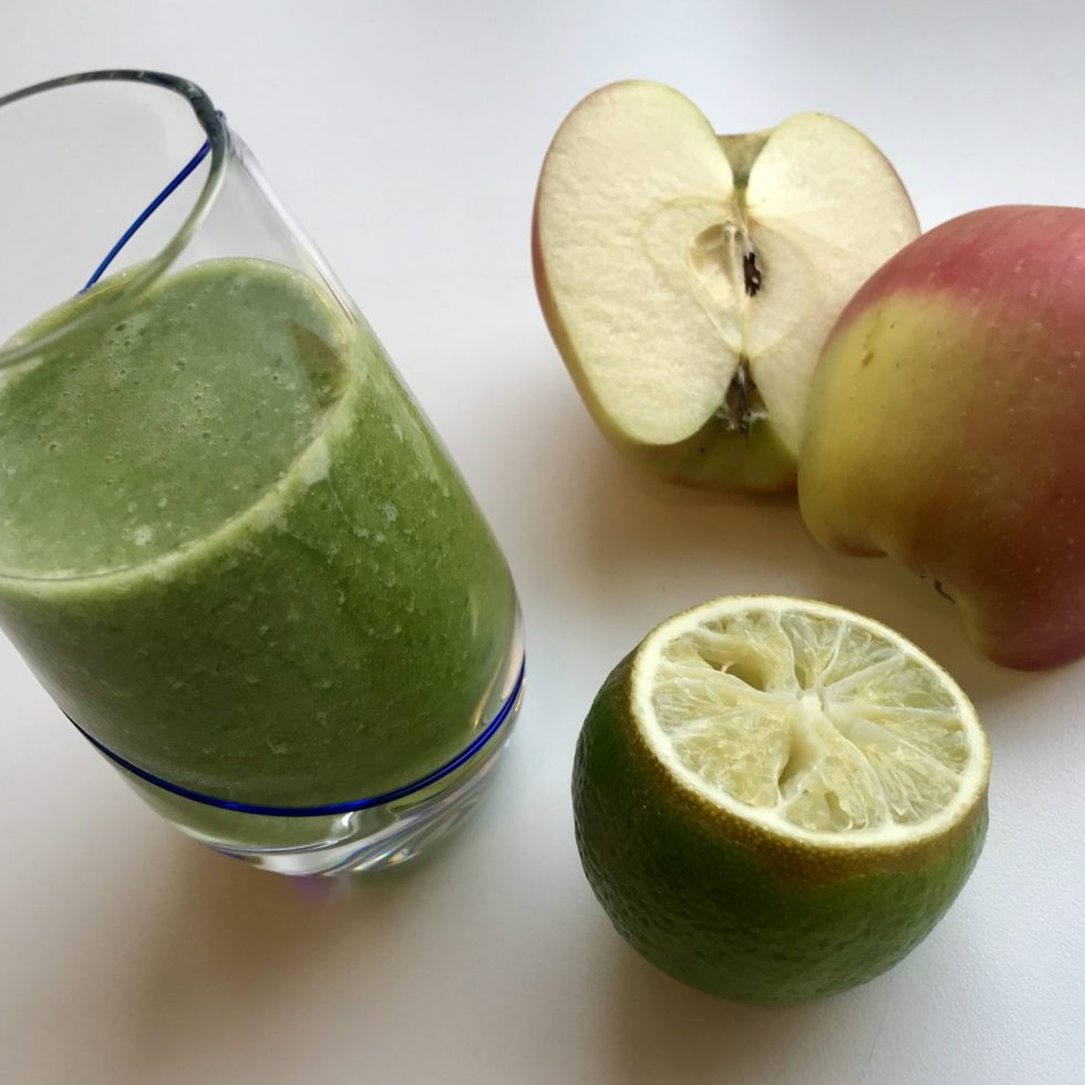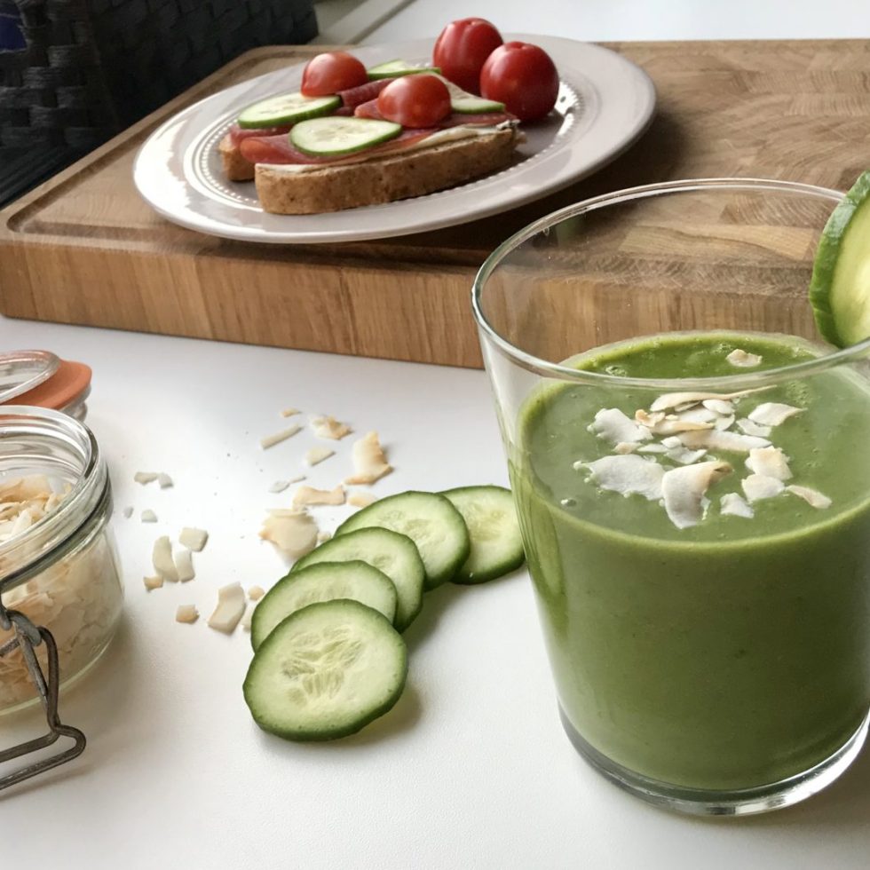 Grønn smoothie og yoghurtbrød med salami