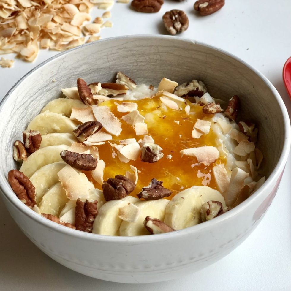 Frokostgrøt av risgrøt laget på kokosmelk med ferskensyltetøy, banan, ristede kokosflak og pekannøtter