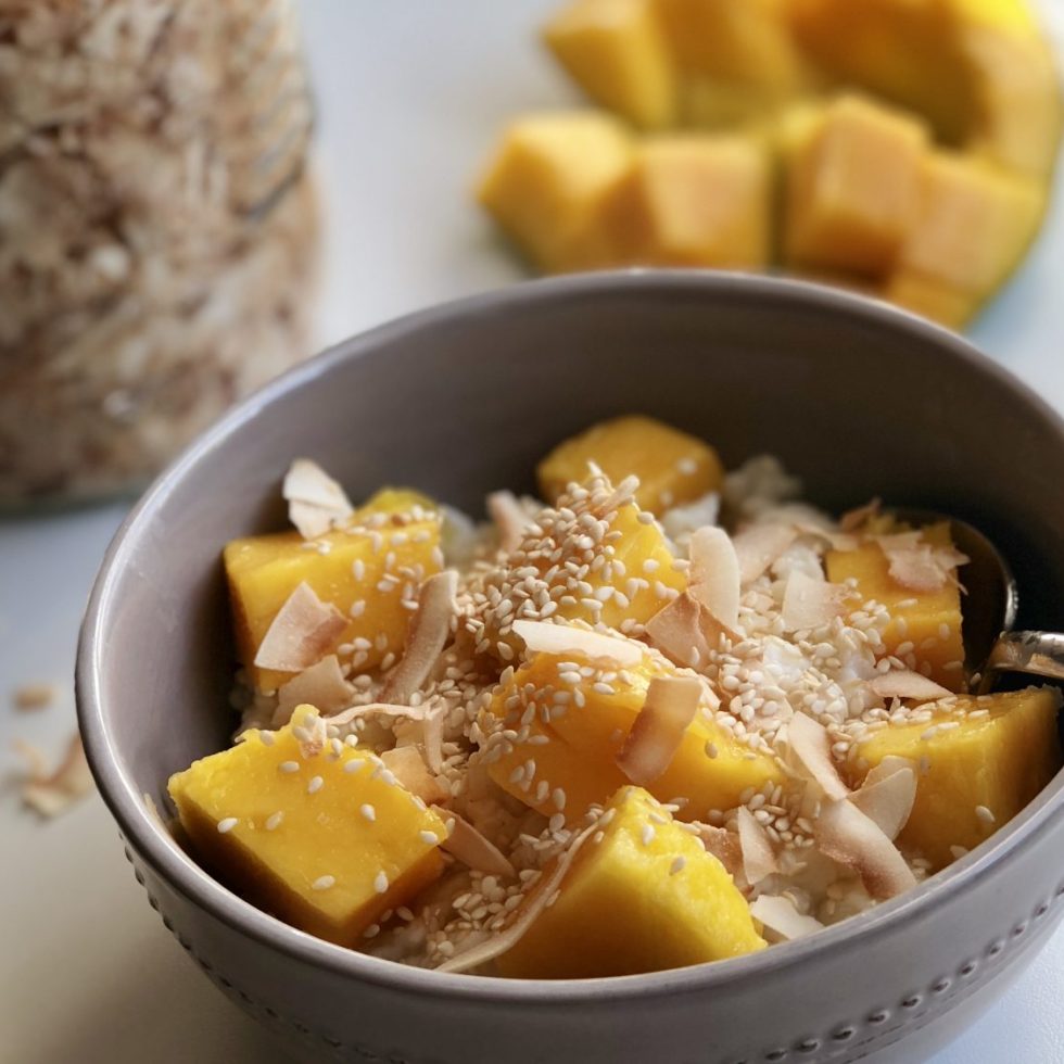 Frokostgrøt av risgrøt laget på kokosmelk med mango, ristede kokosflak og sesamfrø