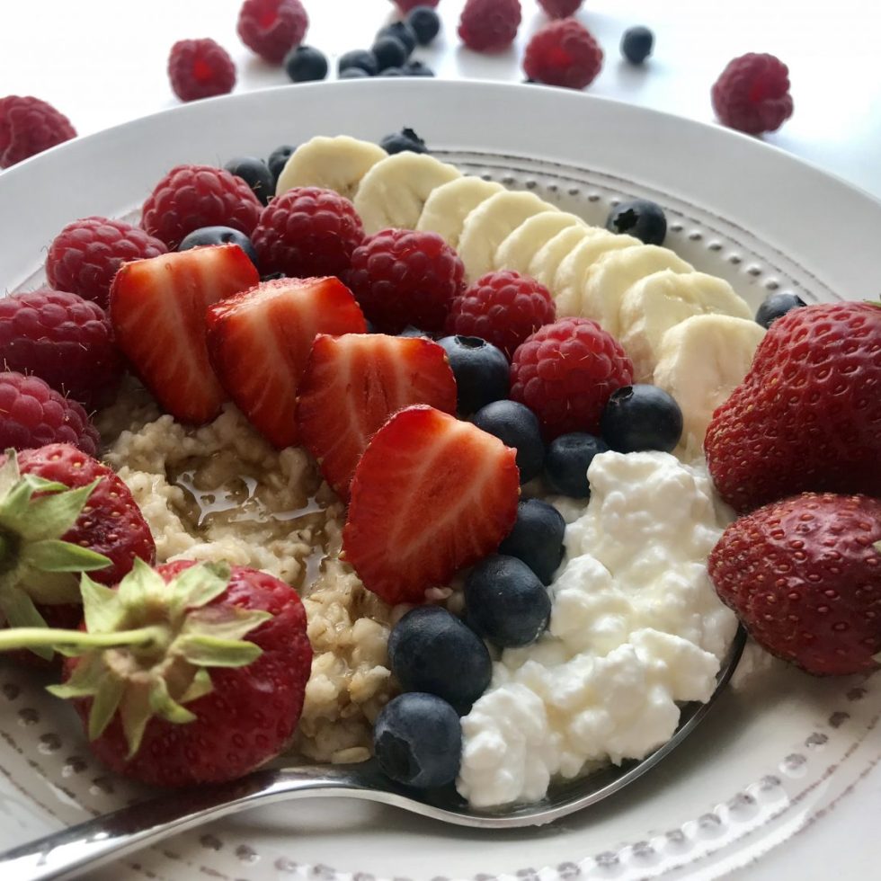 Havregrøt med cottage cheese, lønnesirup, banan og bær