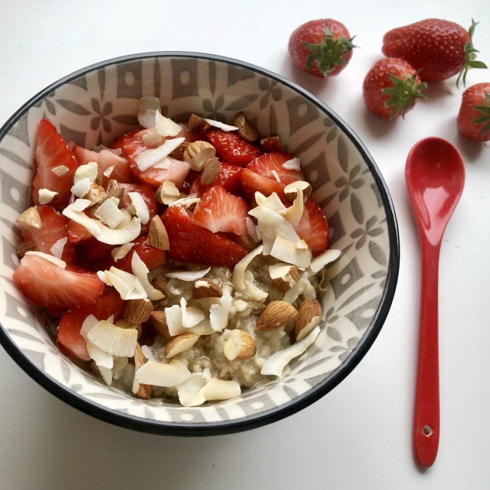 Havregrøt med jordbær, mandler og kokosflak