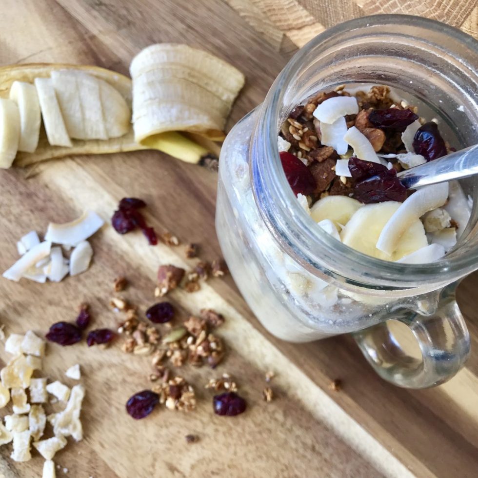 Kjøleskapsgrøt med peanøttsmør, banan, kokosflak og salte peanøtter