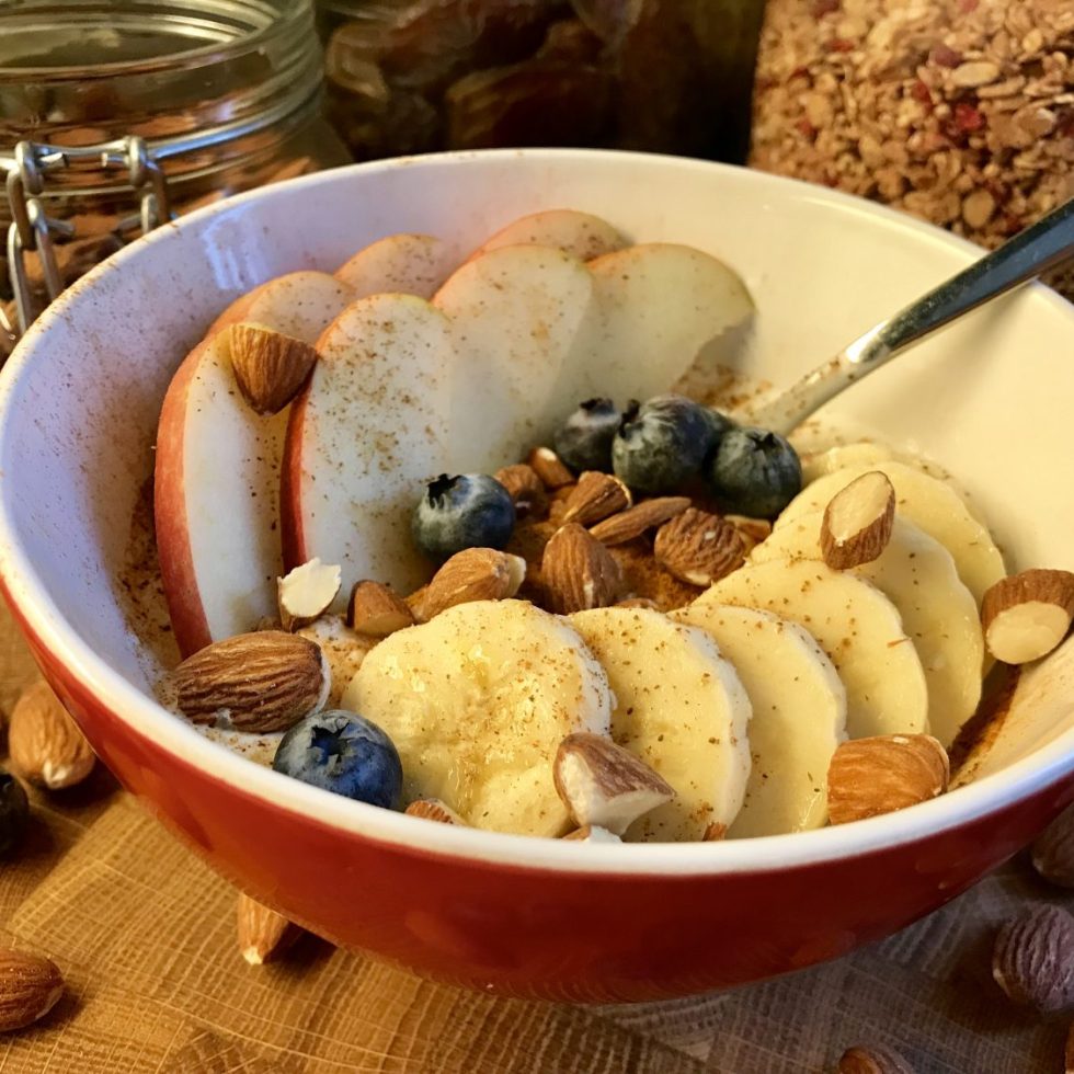 Cottage cheese med eple, banan og stekte mandler