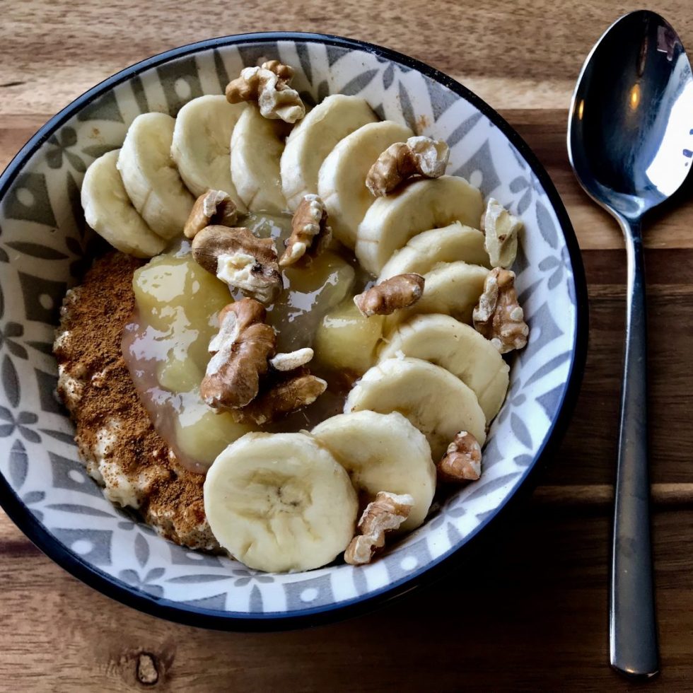 Havregrøt med cottage cheese, syltetøy, banan og valnøtter