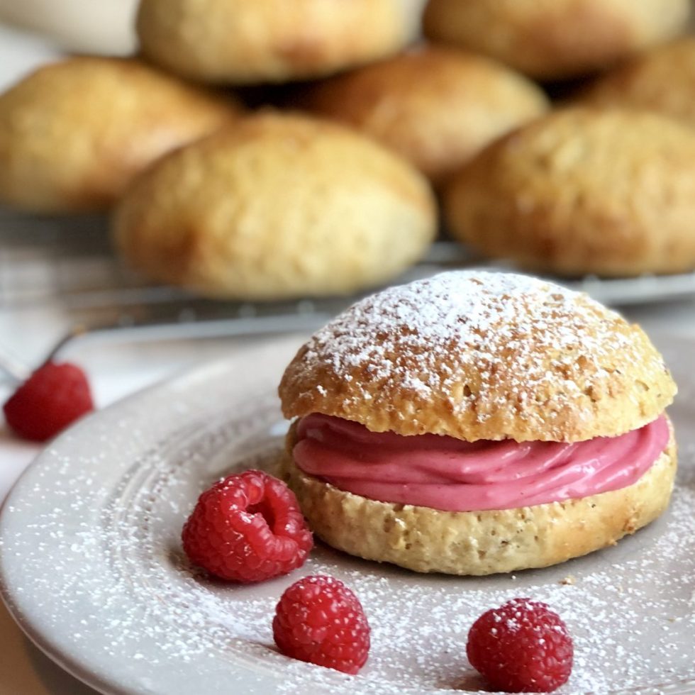 Havre og banan fastelavnsboller med bringebærkrem