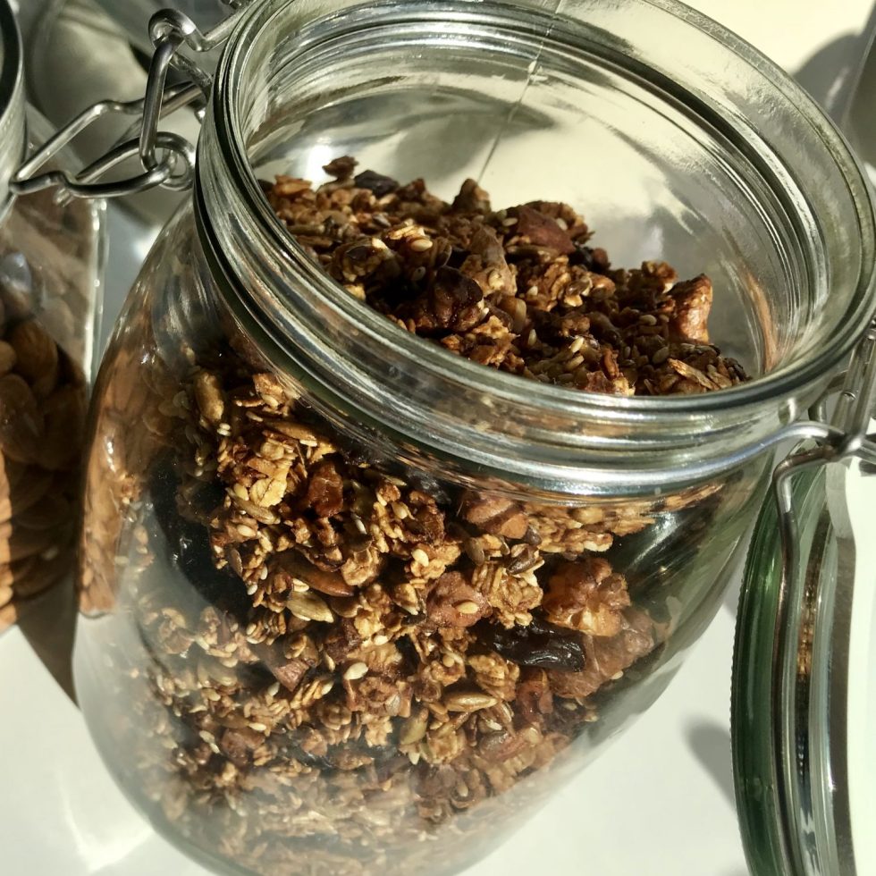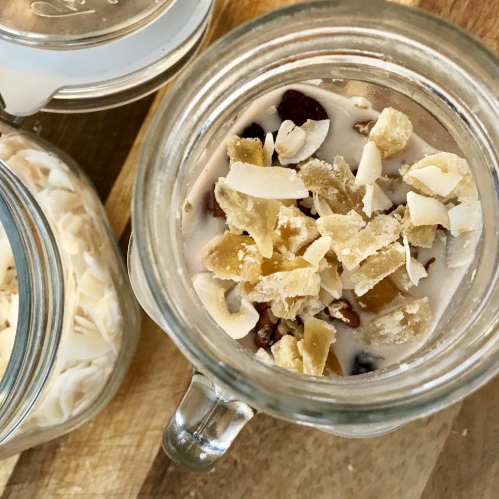 Kjøleskapsgrøt med kokosflak, tranebær, tørket ananas og pekannøtter