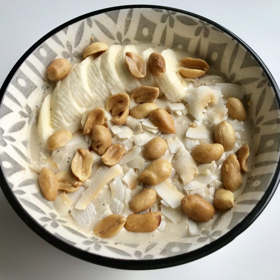 Kjøleskapsgrøt med peanøttsmør, banan, kokosflak og salte peanøtter