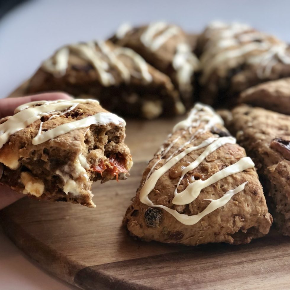 Søte og grove firkorn scones med hvit sjokolade og gojibær