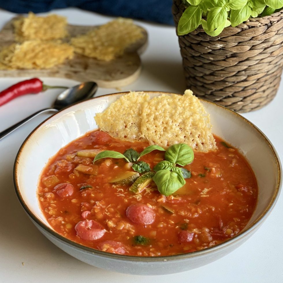 Enkel tomatsuppe med squash og røde linser med parmesanchips