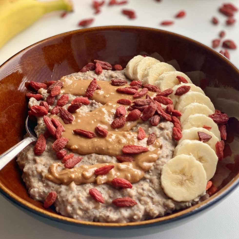 Havre og hirsegrøt med banan, peanøttsmør og gojibær