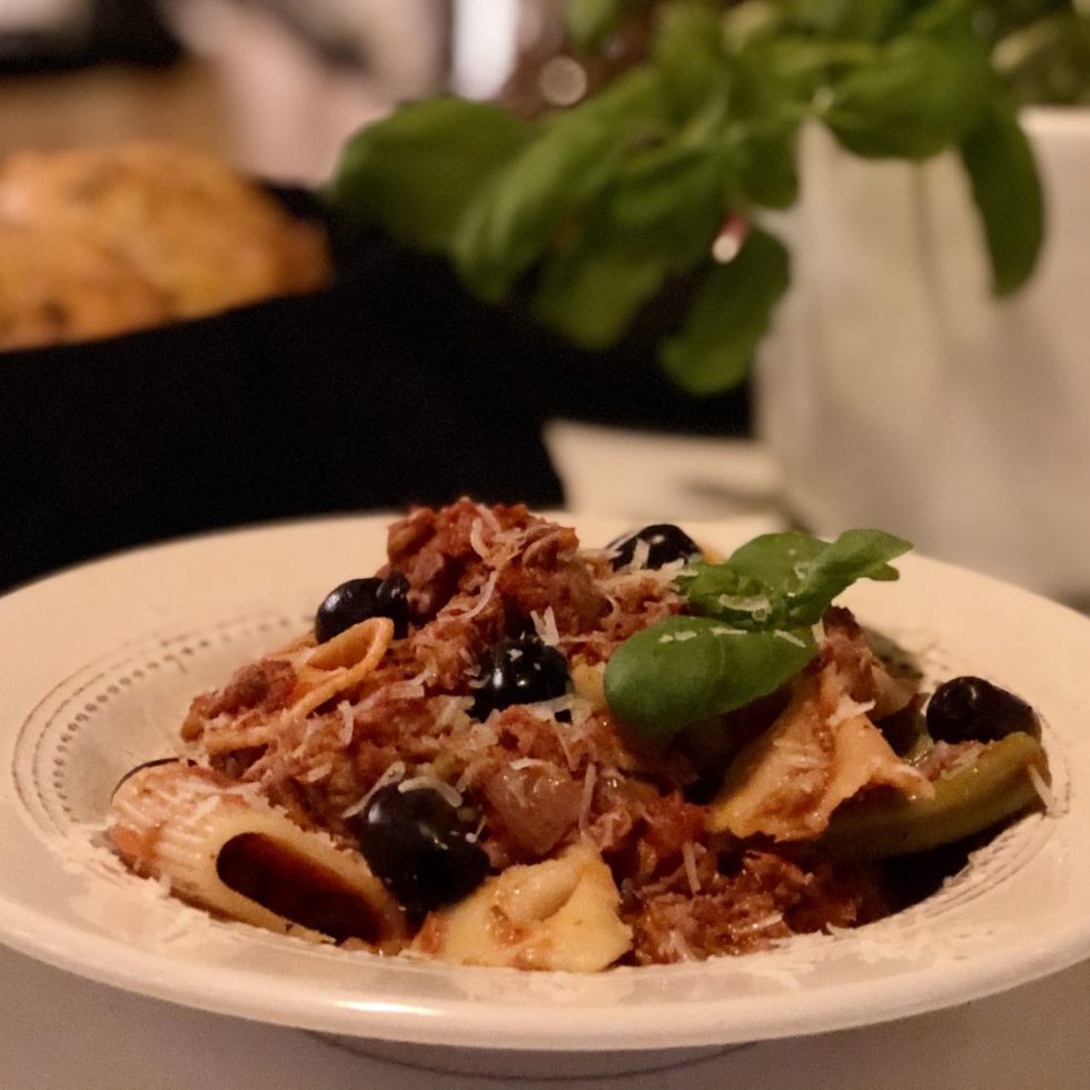 One pot pasta med tunfisk, tomat og sorte oliven