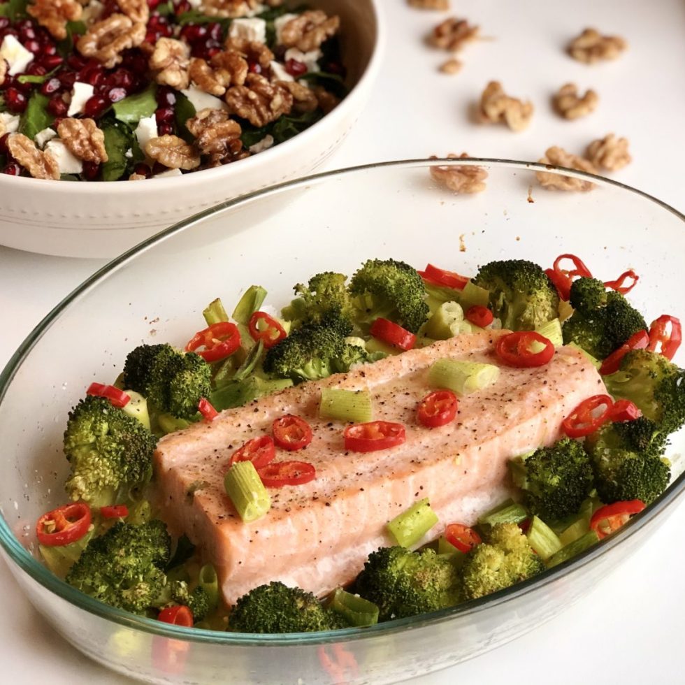 Ovnsbakt salmalaks med chili, brokkoli og vårløk