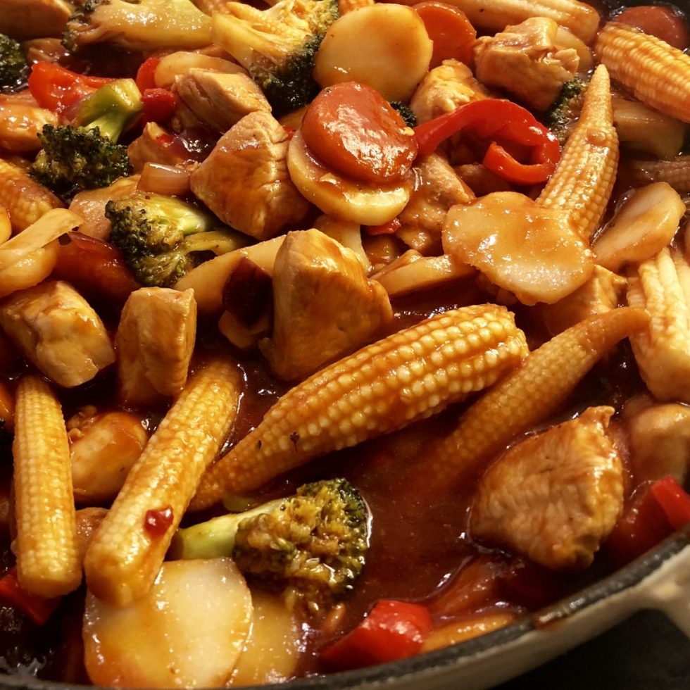 Kyllingwok med eggnudler og hvitløksnaanbrød