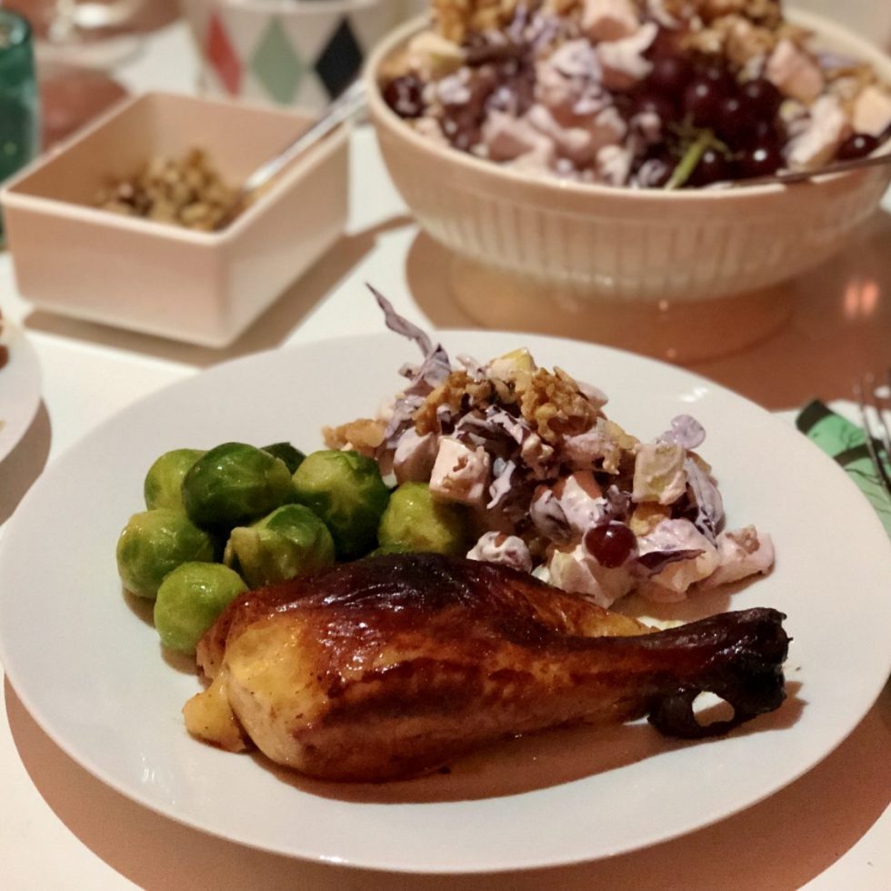 Honningstekt hel kylling med waldorfsalat uten stangselleri