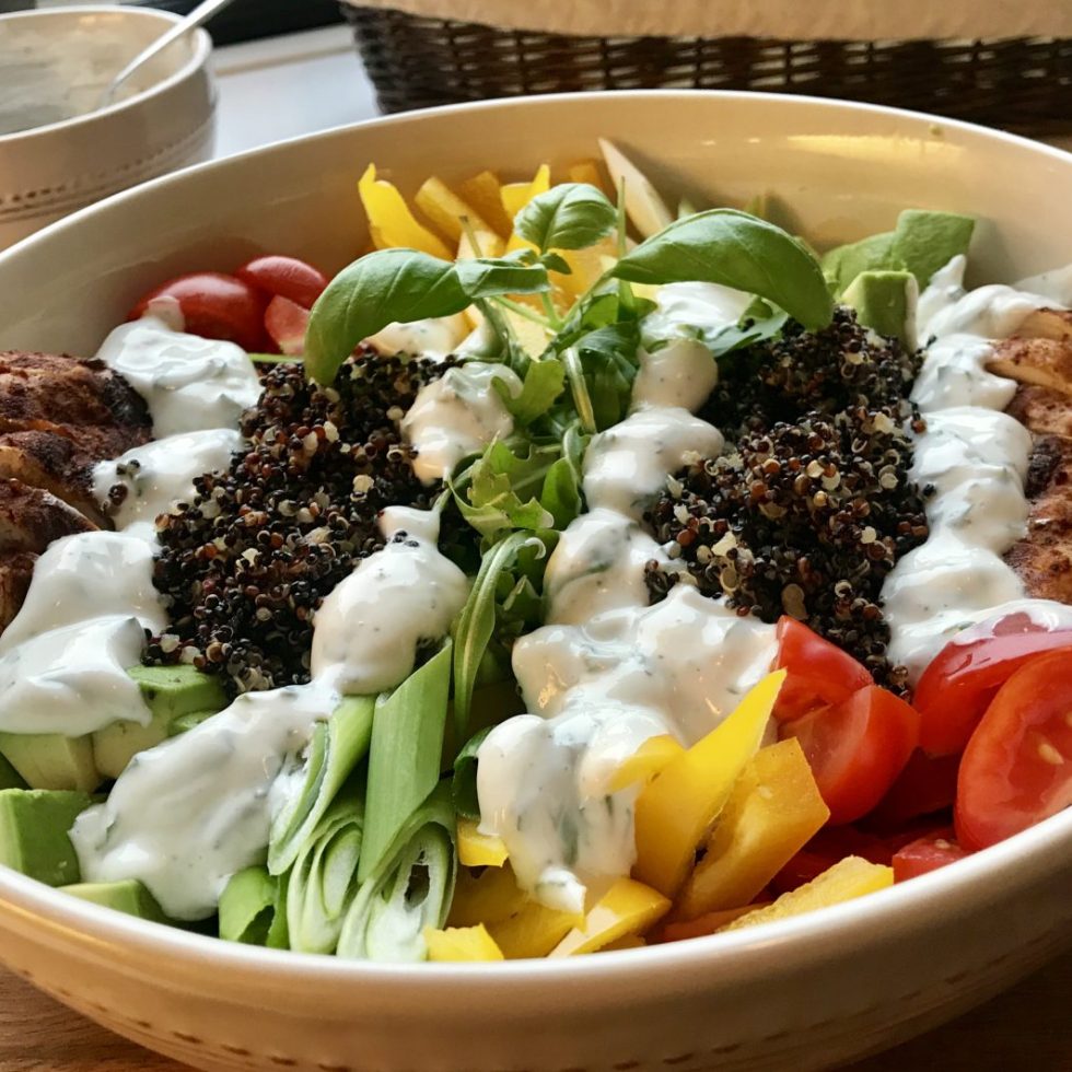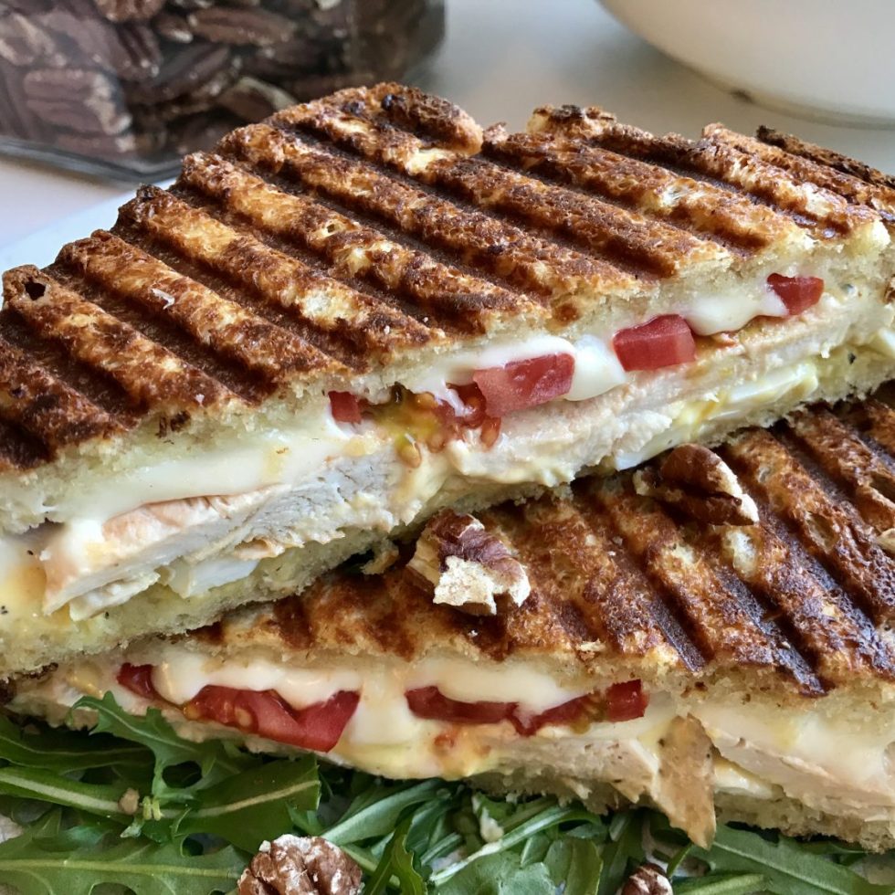 Grillet sandwich med kylling, mozzarella, eggesalat og tomat