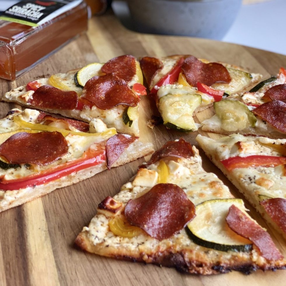 Lefsepizza med hummus, pepperoni, spinat og paprika