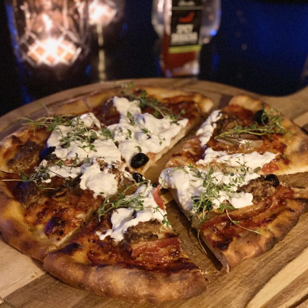 Surdeigspizza med pancetta og burrata