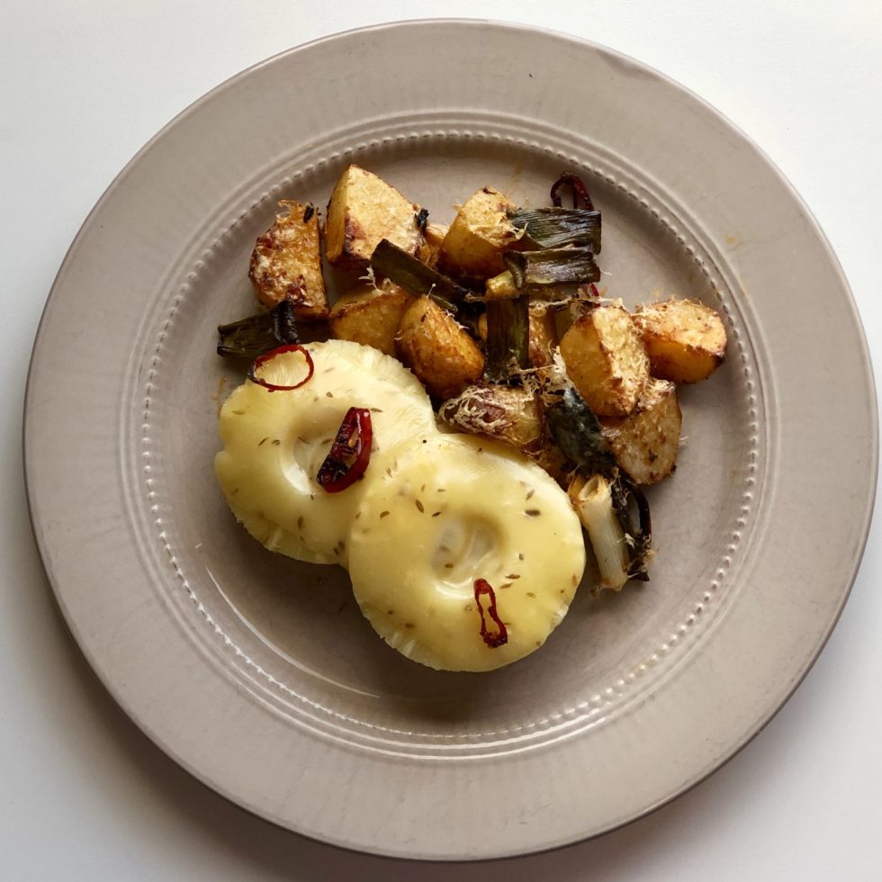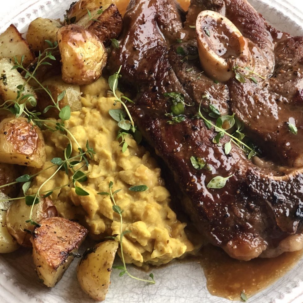Lammelår i skiver med ovnsbakte timianpoteter og kikertstuing