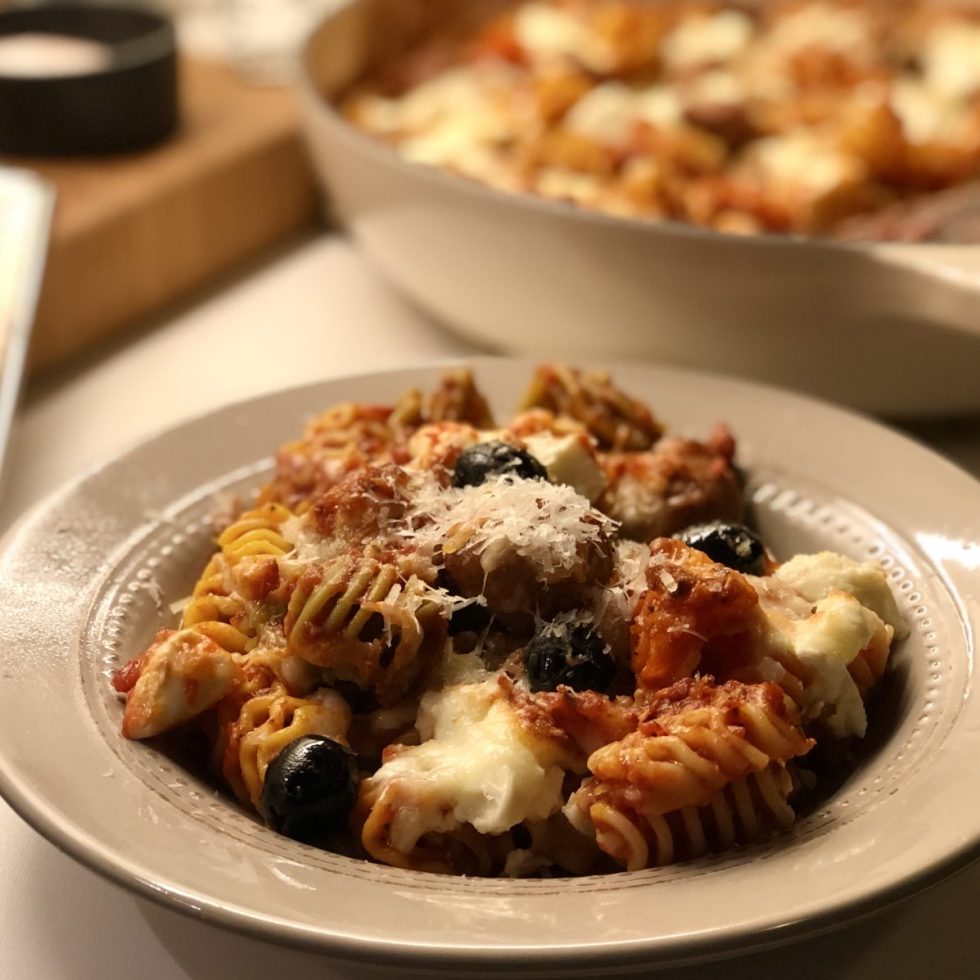 Gratinert pasta med chorizo og fetaost i tomatsaus