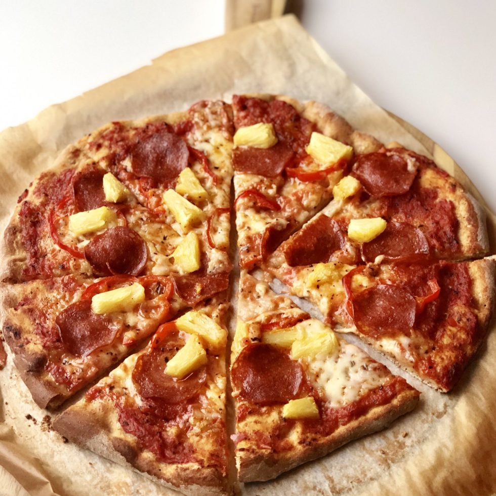 Surdeigspizza med pepperoni, ananas og søtpaprika