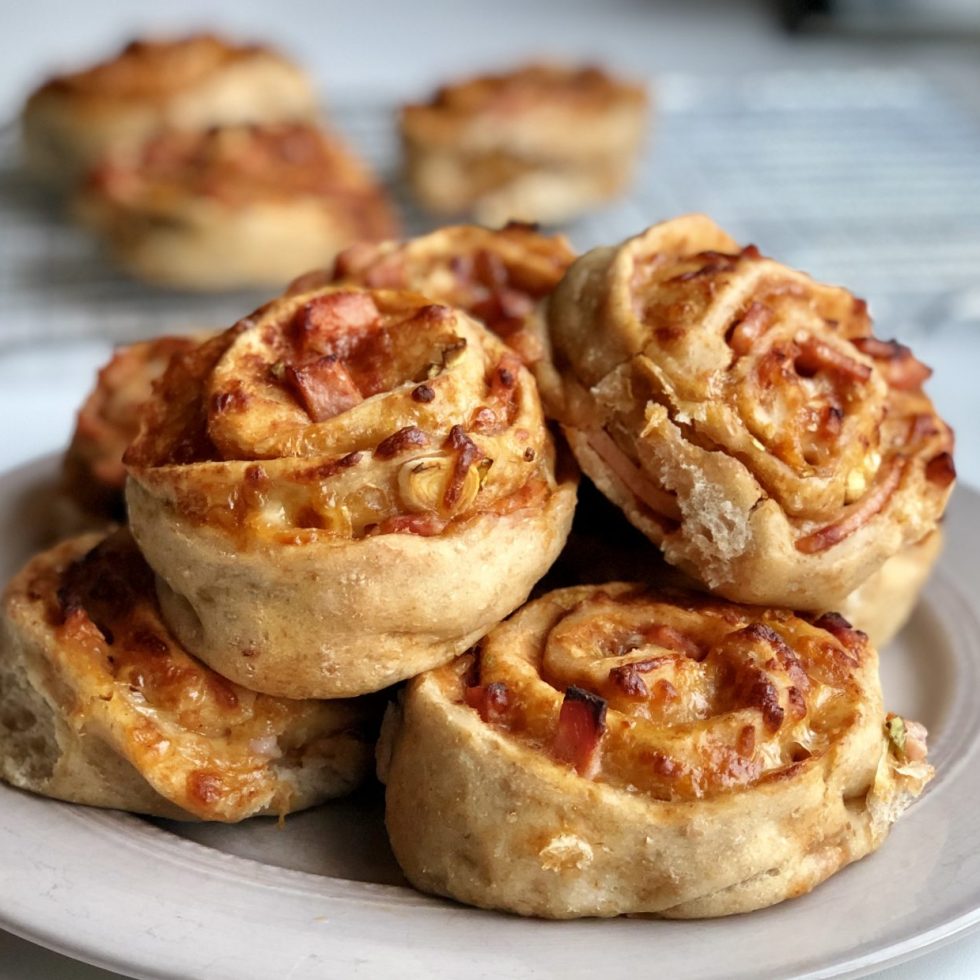 Surdeigs pizzasnurrer av speltmel med ost og skinke