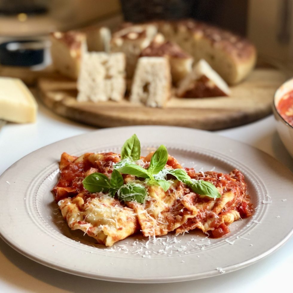 Hjemmelaget ravioli fylt med kjøtt og snøfrisk i tomatsaus