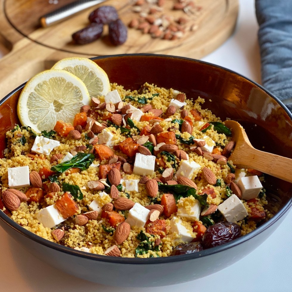 Krydret couscous salat med søtpotet, spinat og fetaost