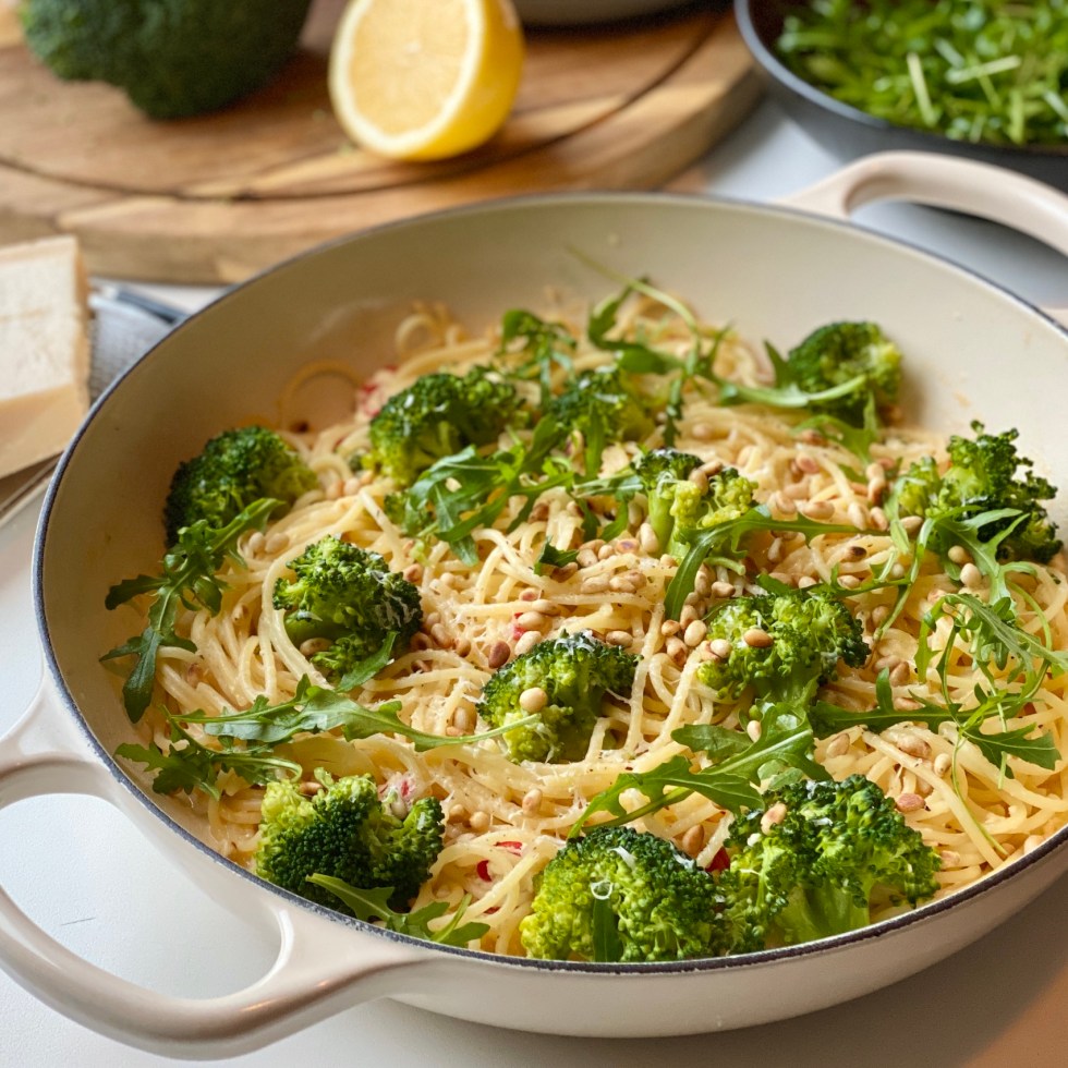Spicy spaghetti med brokkoli, sitronruccola og ristede pinjekjerner