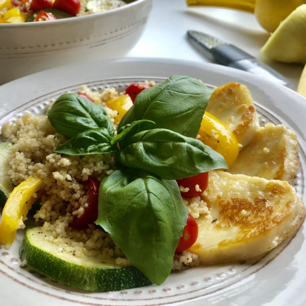 Couscous salat med stekt haloumi, paprika og squash