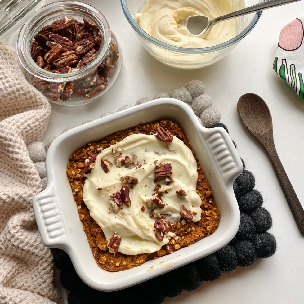 Ovnsbakt havregrøt med gulrot, kremost og pekannøtter