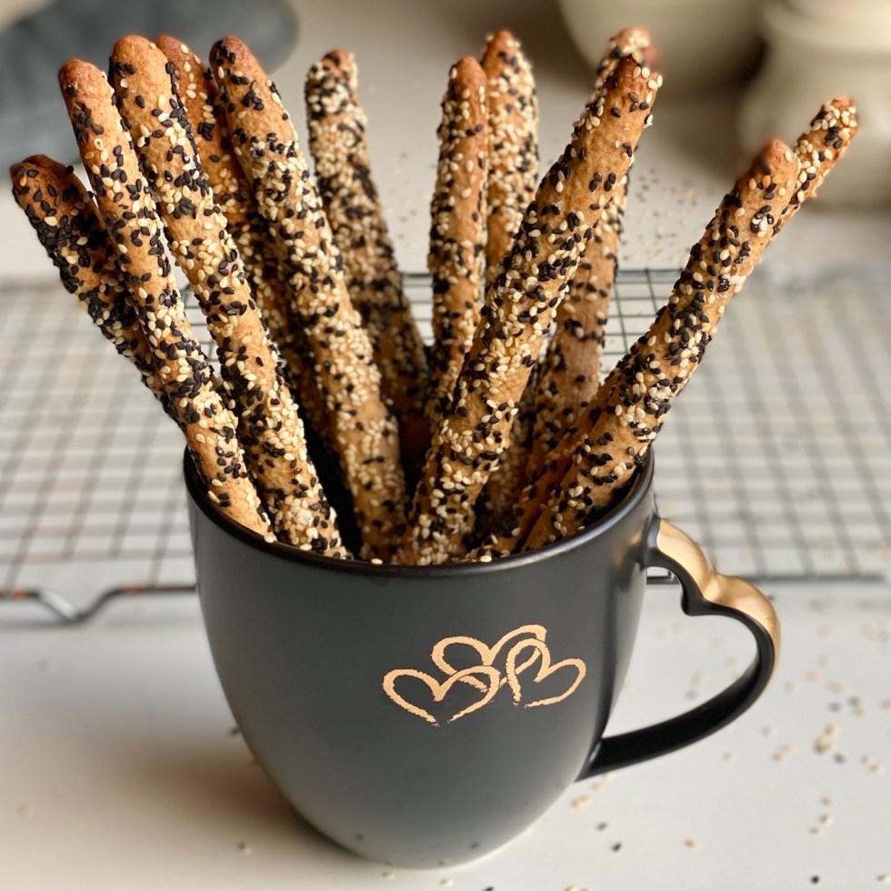Grove surdeigs grissini med hvitløk og sesamfrø