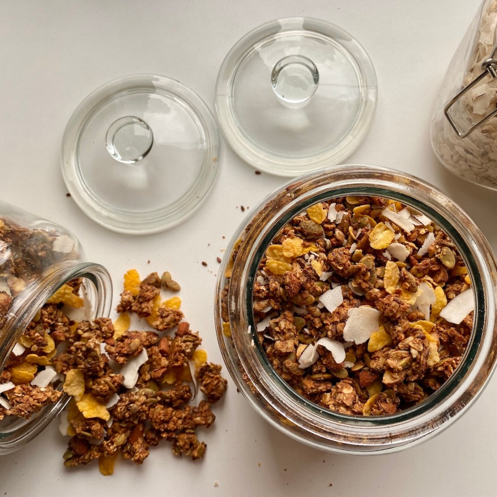 Hjemmelaget granola med peanøttsmør, mandler, cornflakes og kokosflak