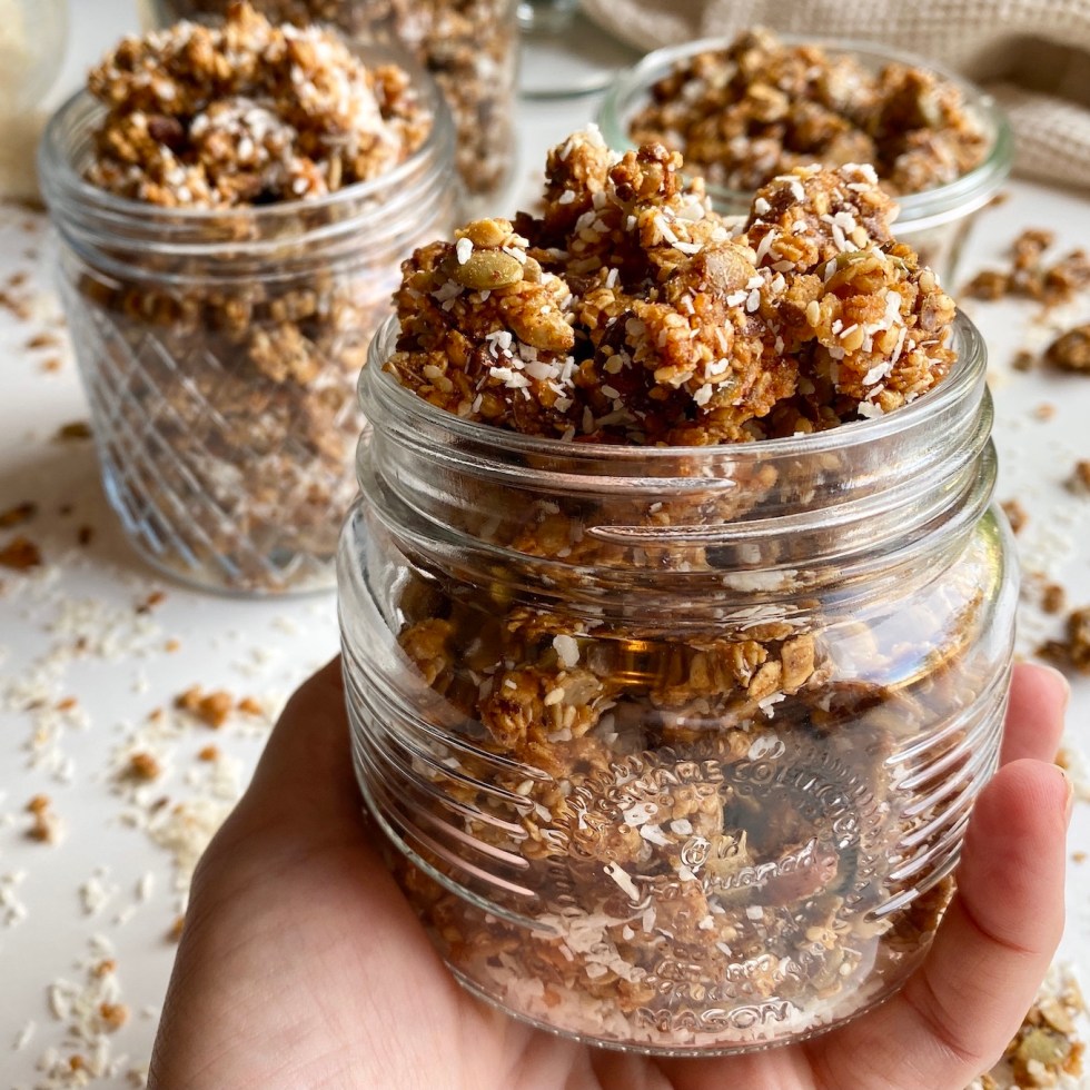 Granola med hjemmelaget appelsinsirup, hasselnøtter og kokos