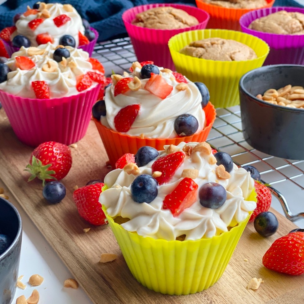 Sunnere banan og peanøtt cupcakes med en lettere frosting