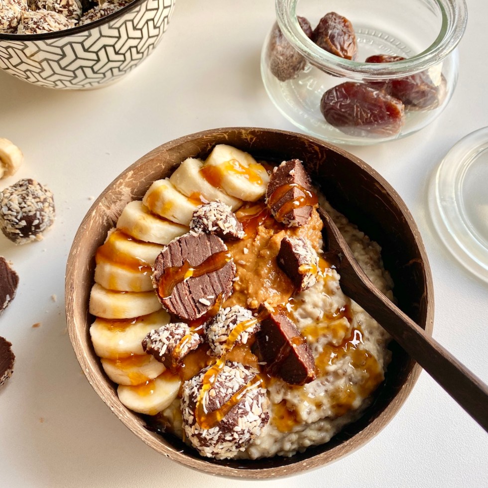 Steel cut havre og hirsegrøt med banan, karamell og peanøttsmør