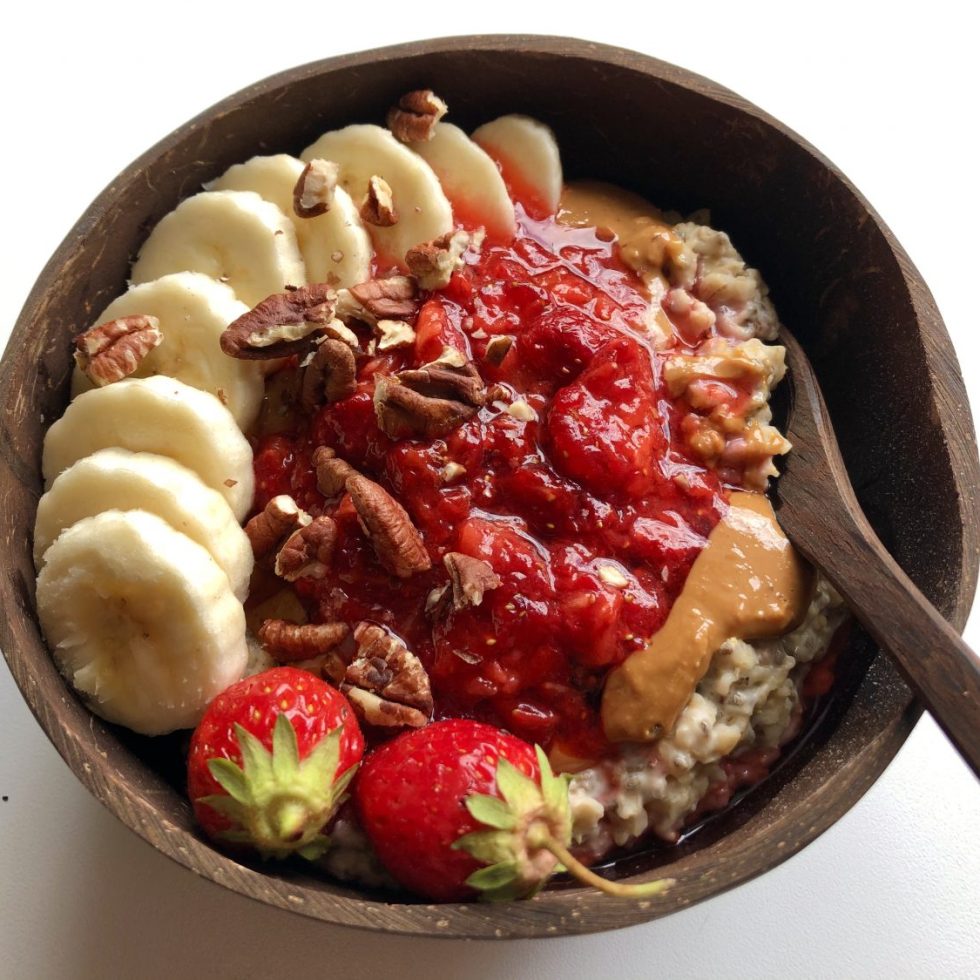 Havre og hirsegrøt med kokos, ananas, banan og pekannøtter