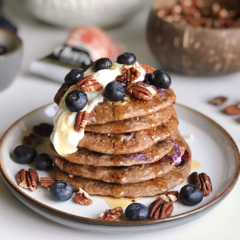 Grove tykke surdeigspannekaker med chevre og blåbær