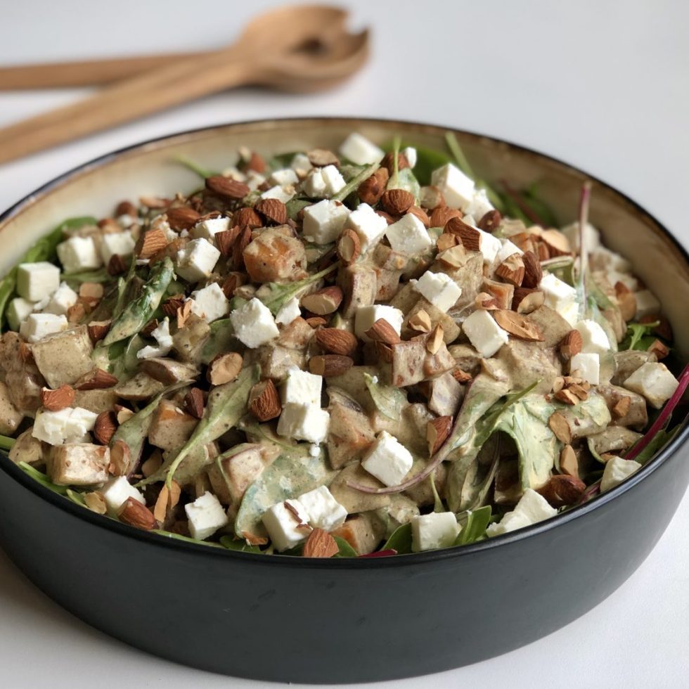 Ovnsbakt potet og søtpotetsalat med fetaost og ristede mandler