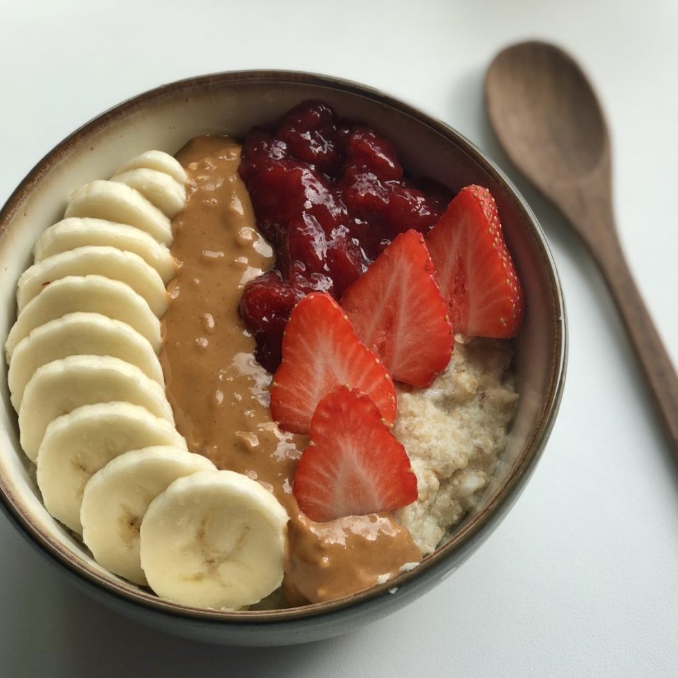 Proteinhavregrøt med peanøttsmør, banan og jordbær