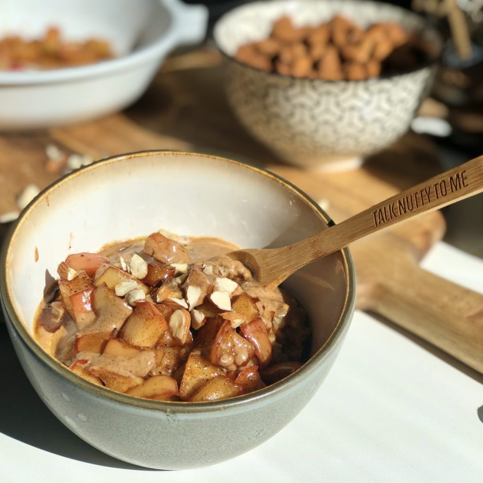 Havregrøt med karamellisert eple, mandelsmør og mandler