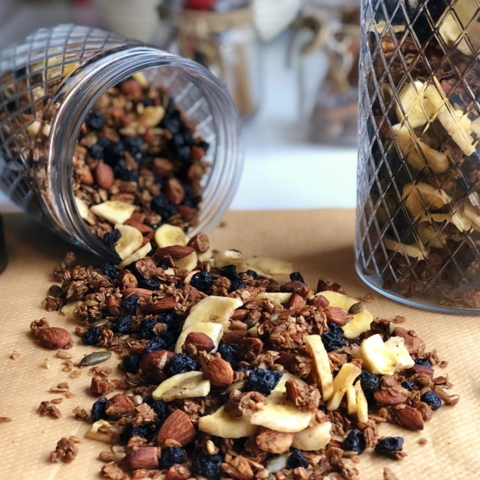 Hjemmelaget granola med tørkede blåbær og bananchips