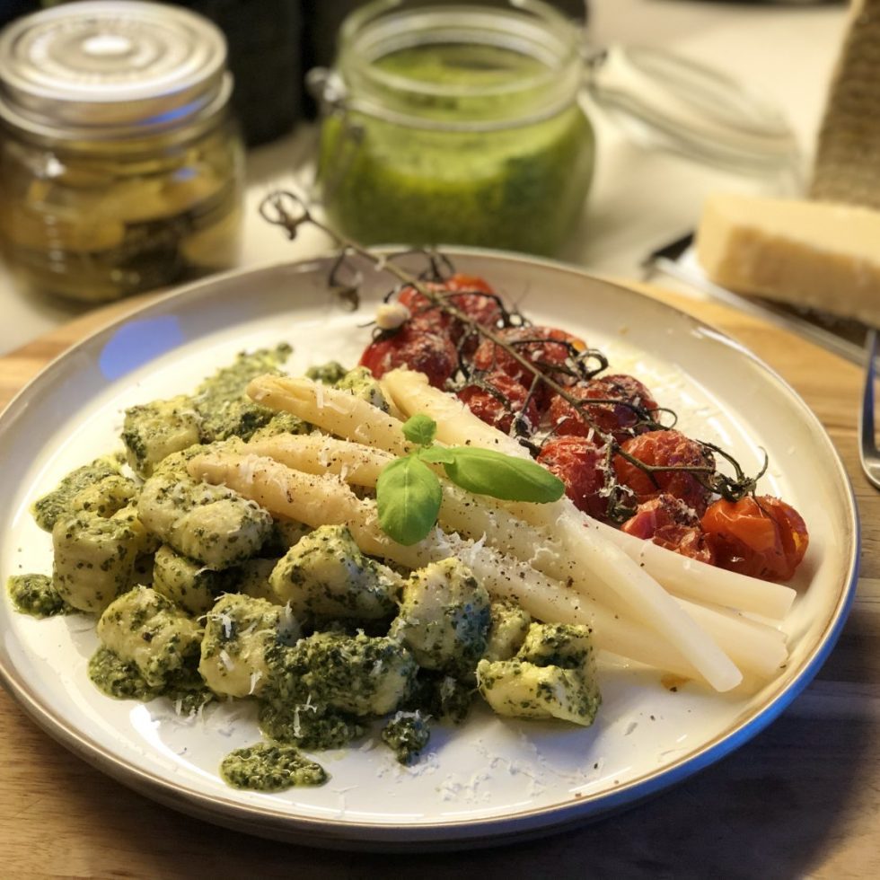 Hjemmelaget gnocchi med spinatpesto, hvit asparges og ovnsbakte tomater