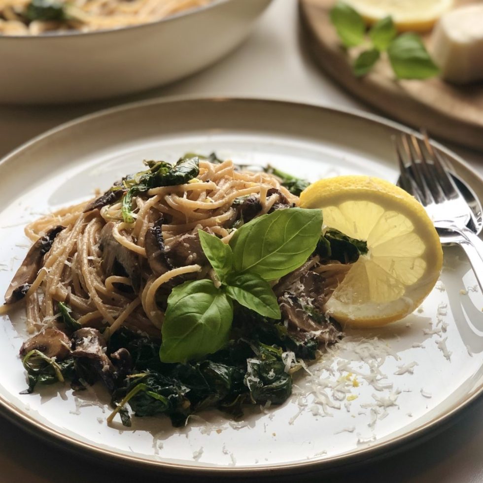 Spaghetti med aromasopp, sitron, ruccola og spinat